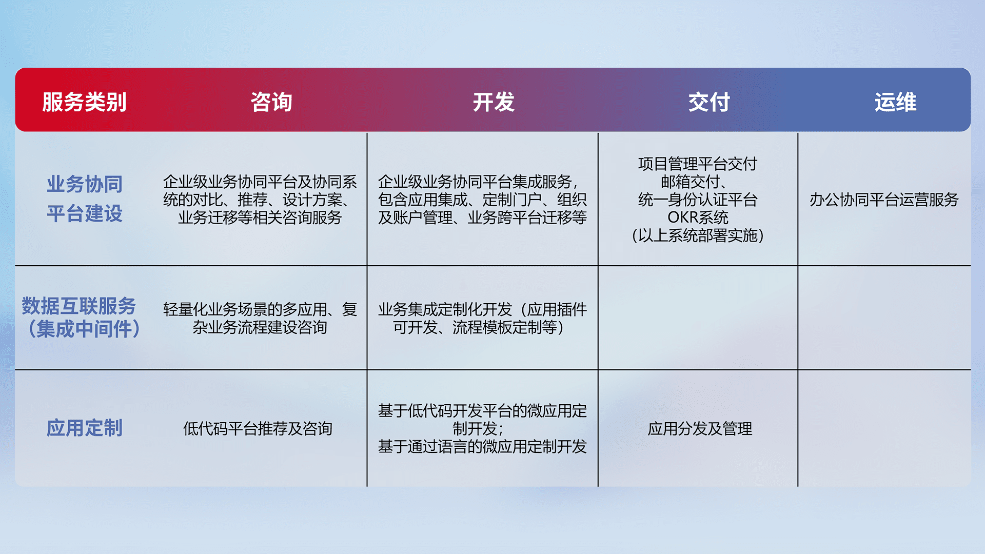 针对钉钉、、、企微、、、、IDaas等平台级产品提供产品的规划、、方案、、、交付、、、定制化开发等服务,,,实现如统一协同办公、、、智能客户服务、、混合会议管理、、智能数据查询、、等业务场景,,,,实现数字化转型。。